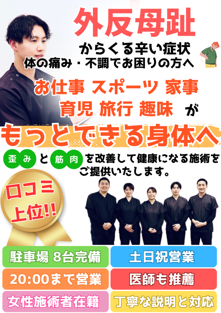 - はい、痛みの軽減や進行予防は十分可能です。 当整骨院では足だけでなく、骨盤矯正や姿勢改善を行い、根本原因にアプローチします。 変形そのものを完全に元に戻すことは難しい場合もありますが、 「痛みなく歩ける状態」を目指します。