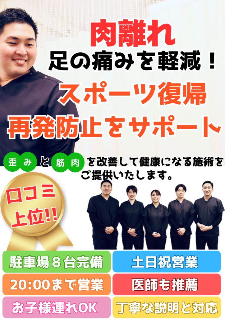 突然の肉離れ、動けない辛さでお悩みの方に、西区で口コミ評価の高い当整骨院・接骨院が、肉離れを根本からケアします。再発しない体作りを一緒に目指しましょう!