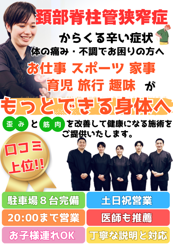 頚部脊柱管狭窄症は、首の脊柱管(神経の通り道)が狭くなることで、神経が圧迫され、首の痛みや腕のしびれ、手足の動かしにくさ などの症状を引き起こす疾患です。放置すると、歩行障害や排尿障害を伴うこともあり、悪化すると手術が必要になるケースもあります。当整骨院・整体院では、頚部脊柱管狭窄症の根本改善を目指し、神経や血流のバランスを整える施術を行っています。