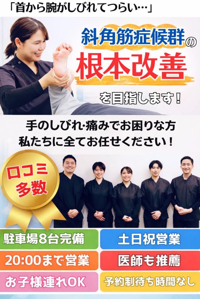 - 原因が斜角筋の緊張や姿勢の歪みにある場合、改善が期待できます。 神経圧迫を軽減し、骨盤矯正や姿勢調整を行うことで、根本から整えていきます。