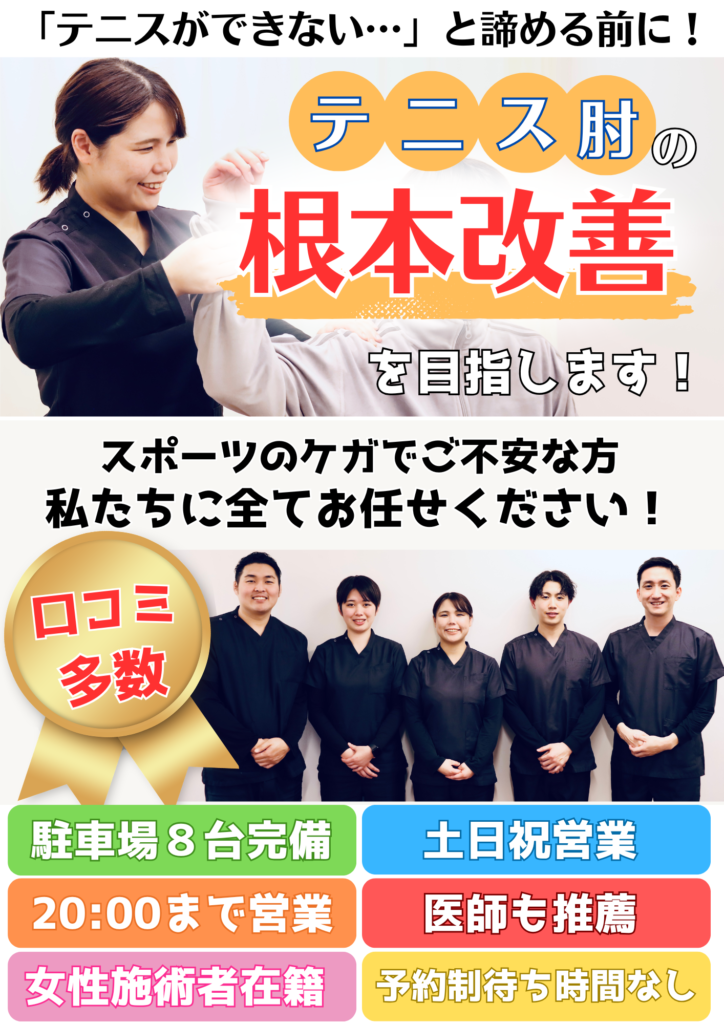 - はい、なります。 テニス肘(外側上顆炎)は、ラケットスポーツだけでなく、 ・パソコン作業 ・家事(フライパン・雑巾絞り) ・工具の使用 ・重い物を持つ作業 などの繰り返し動作でも発症します。 当整骨院では整骨・整体の視点から、肘だけでなく姿勢や骨盤の歪みまで確認します。