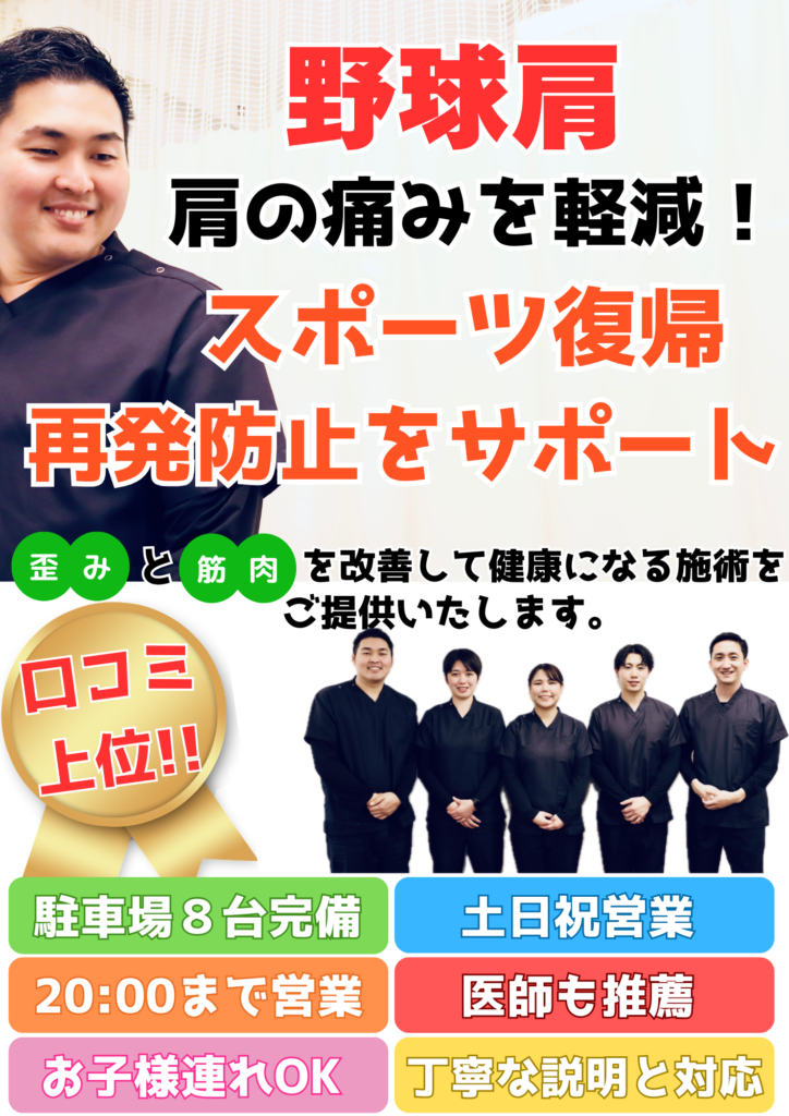 - はい。小学生から対応可能です。 成長期の身体に配慮した、安全で負担の少ない施術を行います。 野球肩は放置すると将来に影響する可能性があるため、早期対応が大切です。