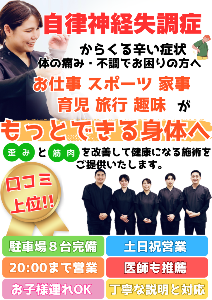 - はい、施術を受けていただくことは可能です。 自律神経の乱れは、姿勢の悪さや身体の歪み、筋肉の緊張などが関係している場合もあります。 当整骨院では整体や身体のバランス調整を通して、自律神経が働きやすい状態へと導くサポートを行っています。