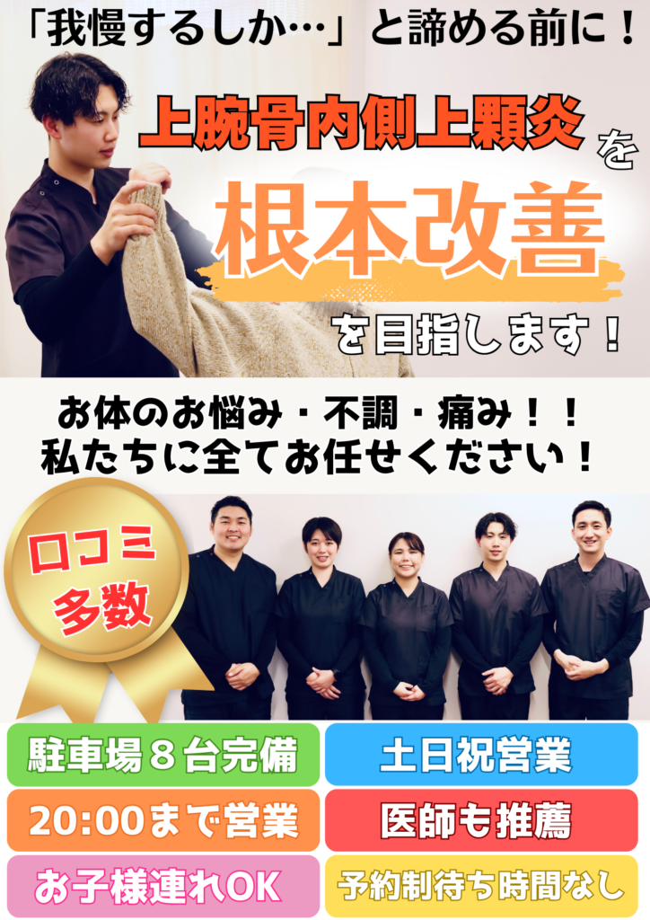 上腕骨内側上顆炎の根本改善を目指した施術を行っています。